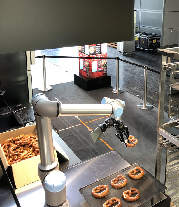 Doch damit nicht genug: Ein weiteres Highlight war die Vorstellung einer erweiterten Roboter-Studie (vgl. Südback 2022). Sämtliche Schritte vom gefrorenen Teigling bis zur Übergabe des gebackenen Produkts in die Schütte erfolgen vollautomatisiert. Und so funktioniert es: Ein kollaborativer Roboter (Cobot) ist mit einem Kamerasystem verbunden und erkennt gefrorene Backwaren im Karton. Diese werden durch einen Greifer aufgenommen und auf Blechen abgelegt, auf denen sie auftauen/garen können. Anschließend werden die Bleche an ein fahrerloses Transportsystem (FTS) übergeben. Selbständig fährt das FTS zum Backofen, dem MIWE FBC, der bereits mit dem richtigen Programm vorgeheizt ist und automatisch die Türe öffnet. Das FTS schiebt die Bleche ein und backt am Ende der Backzeit wieder aus. Von hier gelangen die Waren nach dem Abkühlen per Cobot in die Schütte im Verkaufsraum.