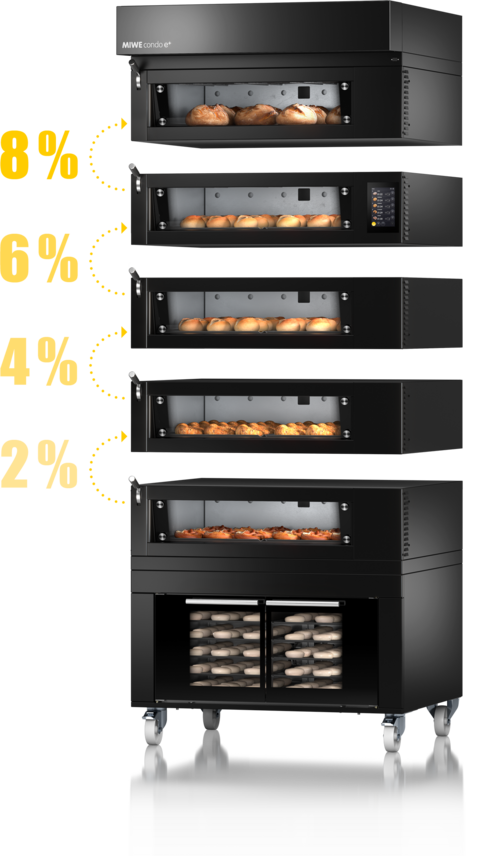 Planen Sie Ihren neuen MIWE condo e+ so, wie Ihr Sortiment es verlangt: von der kompakten Lösung bis zur „Hochstapelei“ mit bis zu 6 Backkammern. In unserem Aktionszeitraum profitieren Sie dabei von einem Staffelrabatt abhängig von der Anzahl der gewählten Backkammern.