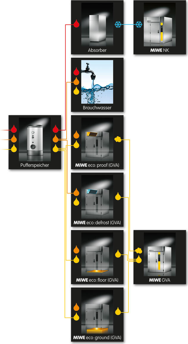 High-temperature water supplies an absorber, generating refrigeration out of warmth. Moderate-temperature water flows into the MIWE eco:defrost (a defroster) as well as into the service water circuit, while low-temperature water supplies the MIWE eco:proof (proofing heat), the MIWE eco:floor (prevents the formation of condensation on the floor) and the MIWE eco:ground (protects against frost heave).