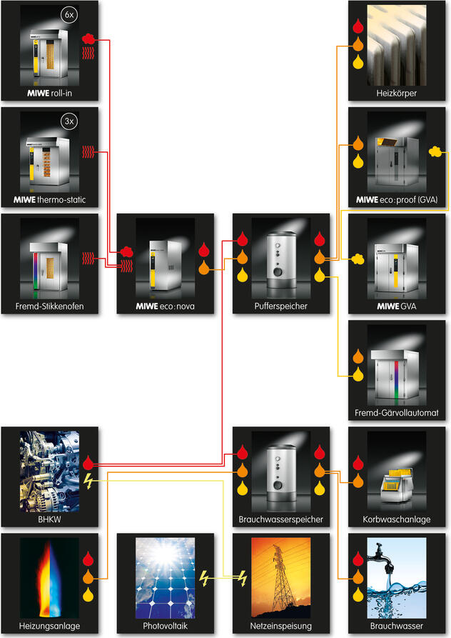 An intelligent storage and regulating system heats up the service water and room and supplies several fully automatic proofing units (via MIWE eco:proof) and a basket washing unit.