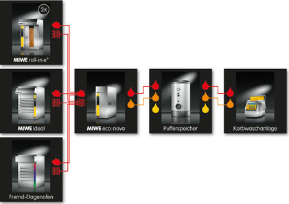 MIWE eco:nova utnytter røykgassen og dampen fra flere ovner - og separerer røykgassen og dampen for å sikre maksimal effektivitet. På denne måten sørger den for to temperaturnivåer. Den ideelle mottakeren: et kurvevaskesystem (med skylle- og tørkesykluser).
